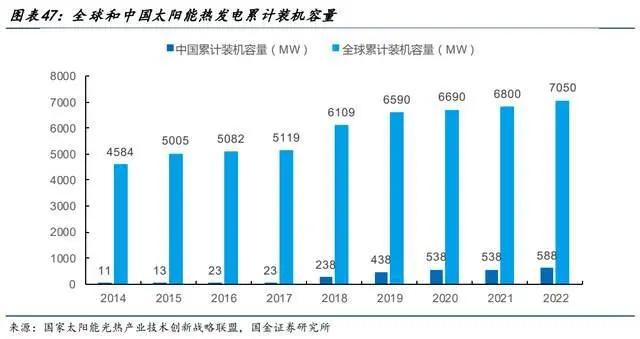 截至22年底,全球太阳能热发电累计装机容量7050MW,中国装机容量588MW,22年中国新增一座光热电站并网发电,装机容量50MW,设计储热时长9小时。