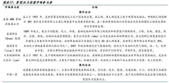 压力容器市场参与者较多,但大型、重型压力容器市场格局更加集中,海外市场参与者包括美国ABB鲁姆斯集团、美国邵尔集团、德国鲁奇集团、日本制钢所株式会社;国内市场参与者除公司外包括中国一重、二重重装、抚机公司、南京化机等企业