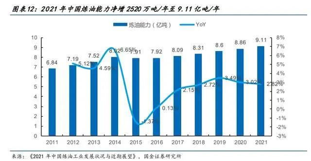 从产能看,2021年中国炼油能力达到9.11亿吨/年,同比增长2.82%。其中新增炼油能力3300万吨/年,主要来自盛虹炼化、镇海炼化改扩建等,山东地方炼厂再退出3家炼厂,合计产能780万吨/年,最终净增炼油能力2520万吨/年,略高于“十三五”期间年均增长2350万吨/年的幅度。