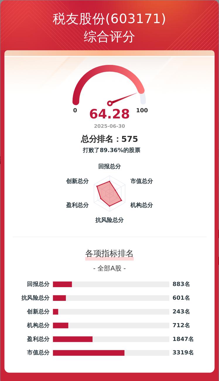 金融界上市公司研究院构建了一套上市公司韧性评价体系,从企业盈利、科技创新、股东回报、经营抗风险、市值表现及机构吸引力六个维度对企业进行量化评分,满分为100分。税友股份的韧性评价总分为64.28分,在A股5405家可比上市公司中排名第575位。