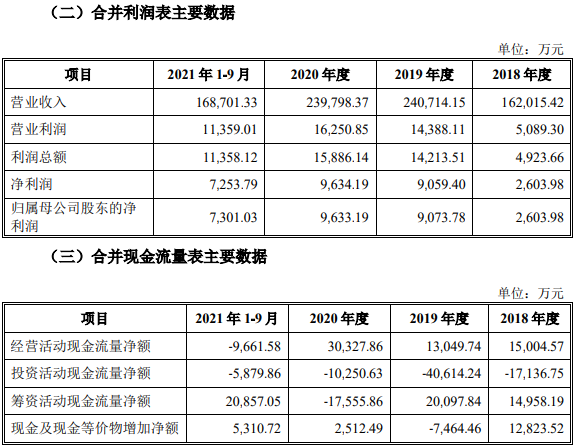 2020年,公司营收微降,净利增长。2018年-2020年及2021年1-9月,汇通集团营业收入分别为16.20亿元、24.07亿元、23.98亿元、16.87亿元,净利润分别为2603.98万元、9059.40万元、9634.19万元、7253.79万元,经营活动现金流量净额分别为1.50亿元、1.30亿元、3.03亿元、-9661.58万元。