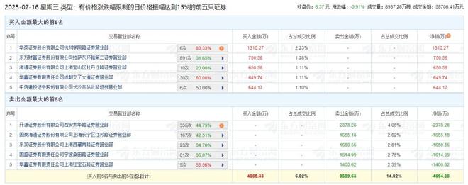 7月15日,则因价格涨跌幅限制的日收盘价格涨幅偏离值达到7%登榜。