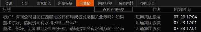 因此,部分投资人在互动中向汇通集团提问,“公司目前是否有在西藏地区有布局或者发展相关业务”“公司是否有参与雅江水电站工程项目”。但公司并未直接正面回答投资者的问题,只表示,会根据经营现状寻找合适的水利水电建设项目。