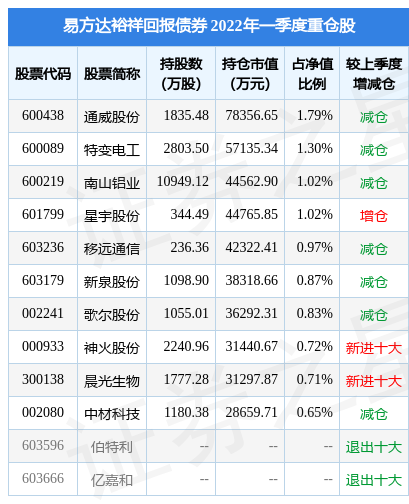 根据2022Q1季报基金重仓股数据,重仓该股的基金共34家,其中持有数量最多的基金为易方达裕祥回报。易方达裕祥回报债券目前规模为438.04亿元,最新净值1.671(5月24日),较上一交易日下跌0.36%,近一年上涨2.2%。该基金现任基金经理为林虎王晓晨。王晓晨在任的公募基金包括:易方达增强回报债券A,管理时间为2011年8月15日至今,期间收益率为140.87%;易方达投资级信用债债券A,管理时间为2013年9月10日至今,期间收益率为58.6%;易方达双债增强债券A,管理时间为2016年12月3日至今,期间收益率为61.86%;易方达恒安定开债发起式,管理时间为2018年5月15日至今,期间收益率为17.98%。林虎在任的公募基金包括:易方达宁易一年持有混合A,管理时间为2021年4月30日至今,期间收益率为1.48%;易方达安心回馈,管理时间为2021年9月8日至今,期间收益率为-6.57%;易方达磐泰一年持有期混合A,管理时间为2021年12月1日至今,期间收益率为0.27%。