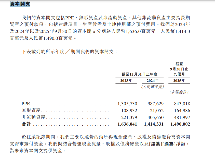 与此同时,公司经营活动产生的现金,还需持续投入到工厂建设与升级中。招股书显示,2023年、2024年和2025年前三季度公司的资本开支分别为16.4亿元、14.1亿元和14.9亿元。