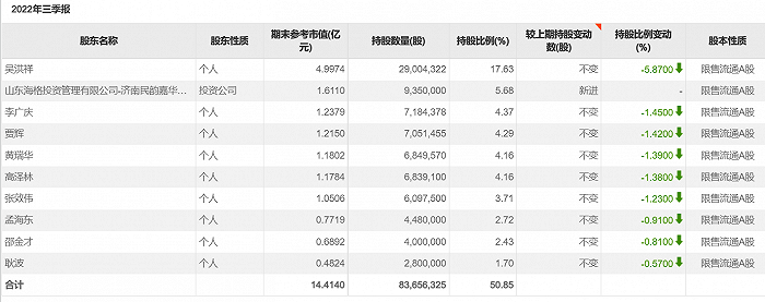 嘉华股份2022年前三季度前10大股东