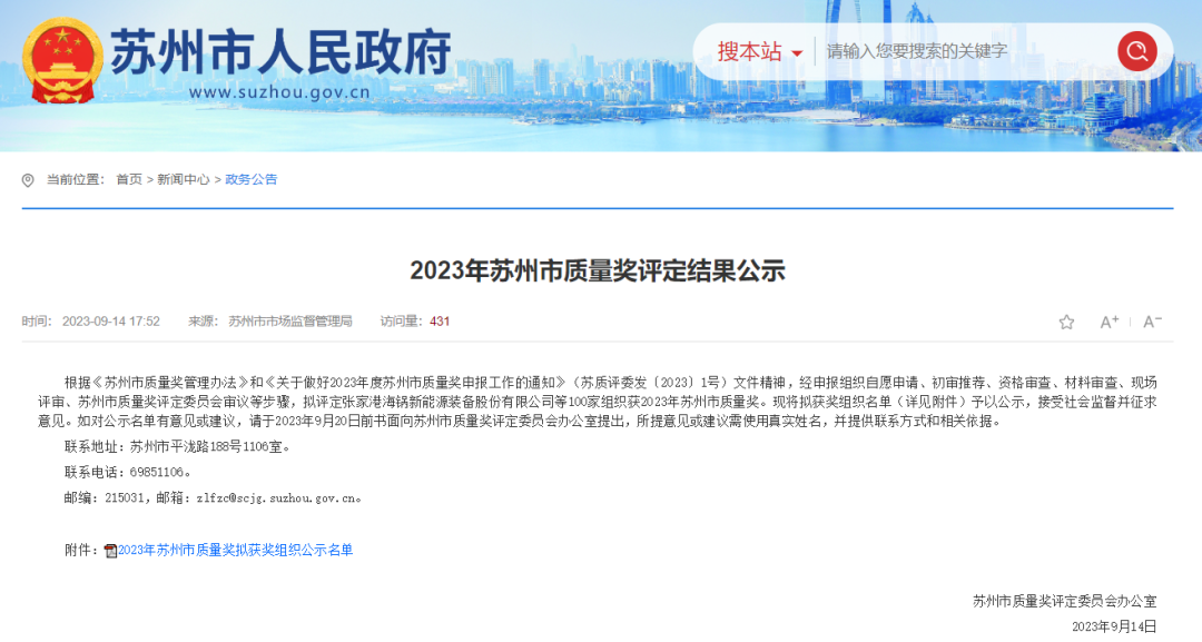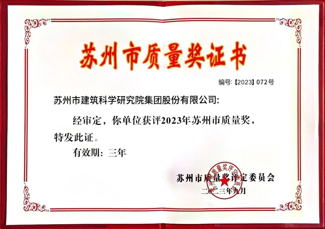 近日,2023年苏州市质量奖评定结果公示,建研院(603183)以全面的质量管理、良好的质量业绩,以及卓越的质量文化氛围营造,脱颖而出,成功入选。
