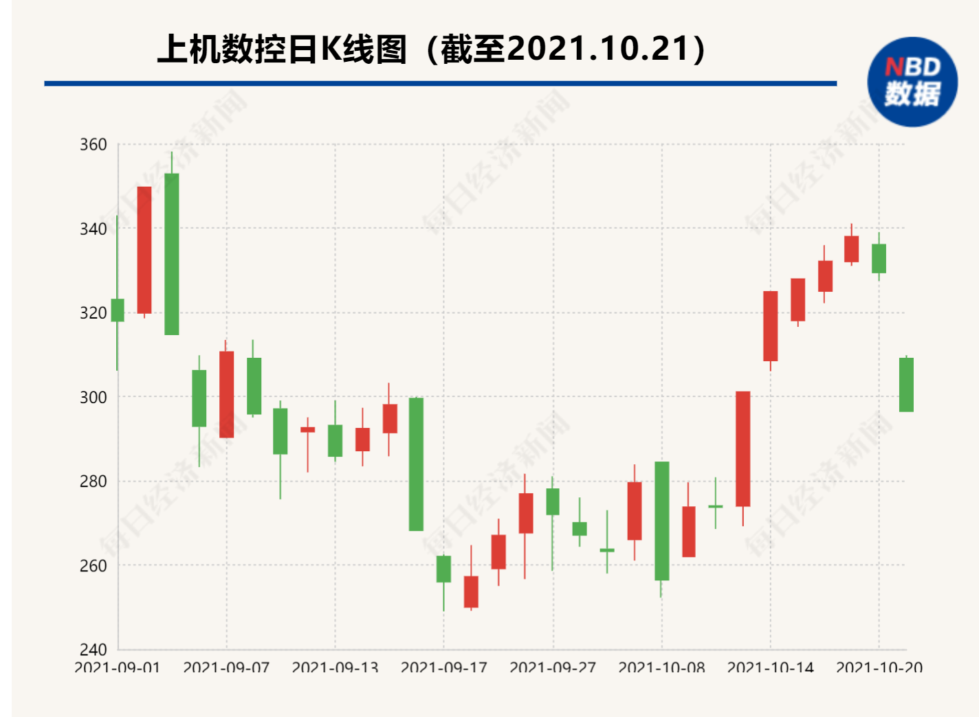 今日(10月21日)9:31,即A股开盘后仅1分钟,上机数控(603185,SH)股价便被死死按在跌停板上。截至下午收盘,上机数控报296.45元/股,下跌10%,跌停板上仍有2.39万手,对应市值超7亿元。