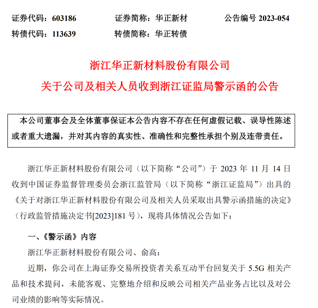 浙江证监局在警示函中指出,华正新材近期在互动平台回复关于5.5G相关产品和技术提问,未能客观、完整地介绍和反映公司相关产品业务占比以及对公司业绩的影响等实际情况。