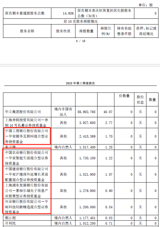 根据华正新材三季报披露,华安基金旗下3只产品进入该公司前十大股东名单。其中,华安媒体互联网混合持有241.8万股,是公司的第三大股东。此外,华安智能生活混合、华安沪港深外延增长灵活配置混合也是华正新材的前十大股东。