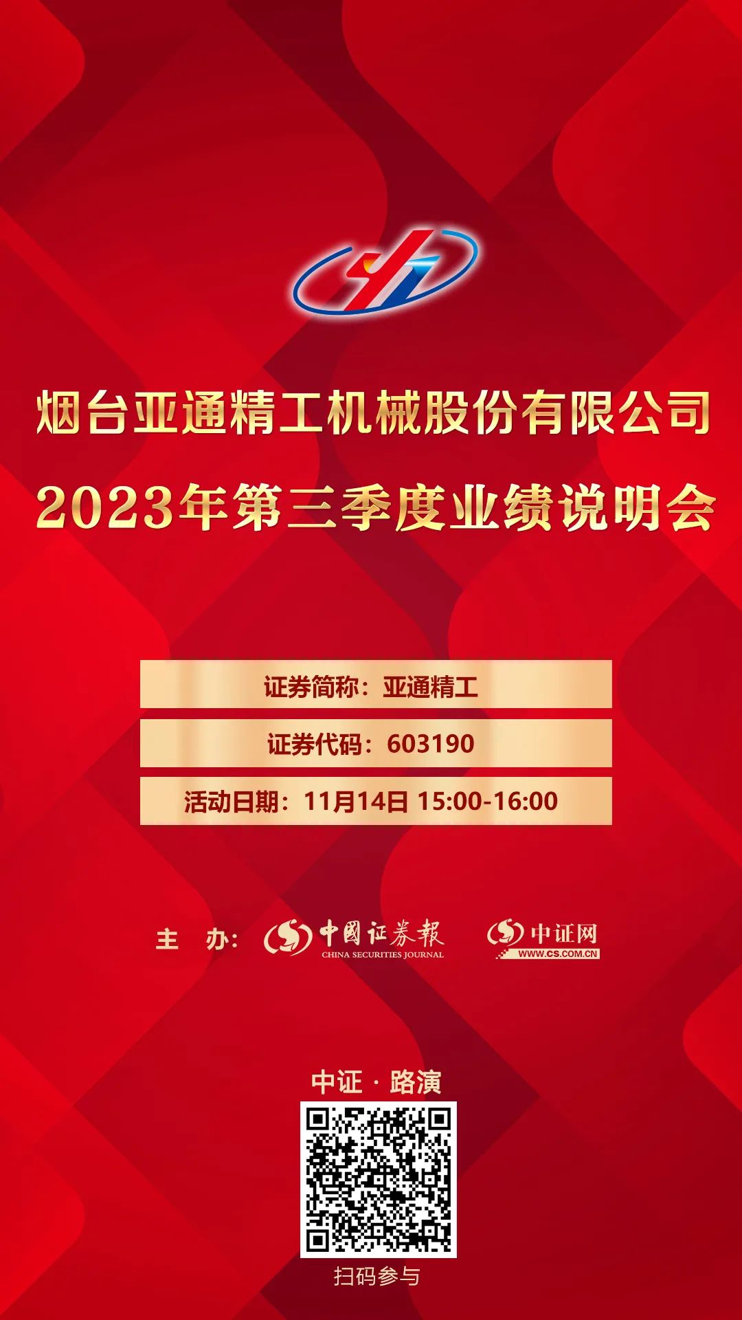 烟台亚通精工机械股份有限公司2023年第三季度业绩说明会11月14日在中证网举行