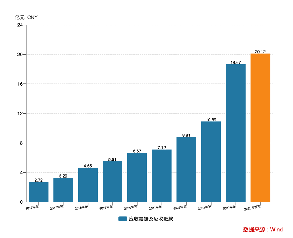 2024年,望变电气经营现金流同比大幅下滑92.81%至0.21亿元,与此同时公司应收票据及账款已经连续多年快速增长,由2016年的2.72亿元飙升至2024年的18.67亿元,2025前三季度继续增至20.12亿元。