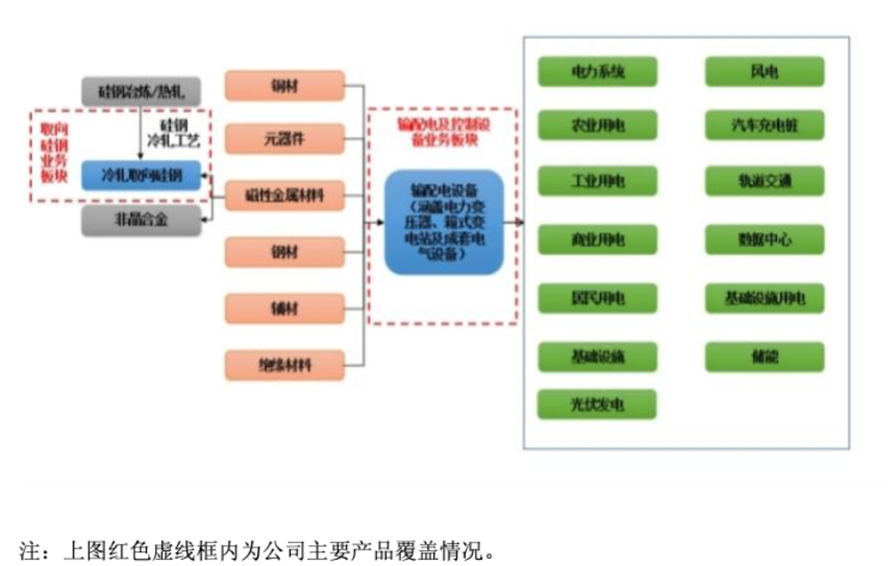 望变电气主营业务为研发、生产和销售输配电及控制设备和取向硅钢,分属两个行业,其中输配电及控制设备业务属于电气机械和器材制造业的输配电及控制设备制造子行业,产品主要包括电力变压器、箱式变电站、成套电气设备、铁芯等。