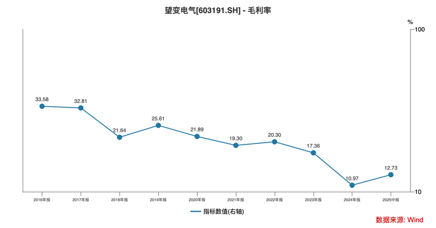 要知道的是,作为望变电气第一大收入来源的输配电设备业务,其一直以中低压变压器、箱式变电站为主,2025年推出的40.5kV智能充气柜虽进入国家电网集采,但同类产品市场份额非常低,且面临特变电工、金盘科技的价格压制,毛利率难有起色。