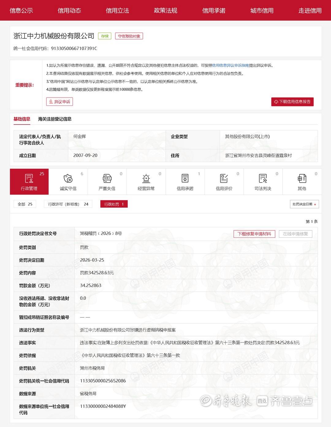近日,齐鲁晚报·齐鲁壹点记者从信用中国获悉,中力股份(603194)因涉嫌进行虚假纳税申报案,被湖州市税务局罚款342528.63元。 中力股份是一家靠产品驱动发展、创新引领变革,旨在打造工业物流4.0的全球化科技企业,专业从事电动仓储叉车、智能搬运机器人及叉车开发、制造及服务,为全球用户提供绿色化、智能化、数字化的物料移动解决方案。
