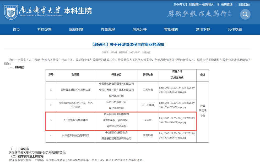 为落实教育部高校毕业生“2026春季促就业攻坚行动”要求,践行就业能力提升“双千”计划,嘉环科技与南邮推出覆盖全校的人工智能应用集成微课程,该课程创新采用“理论、实操、认证”三位一体融合模式,从基础理论、核心算法逐步延伸至框架搭建与技术集成。课程内容精准对接人工智能工程技术人员认证技能要求,将认证标准融入教学全过程,切实提升学生就业核心能力。