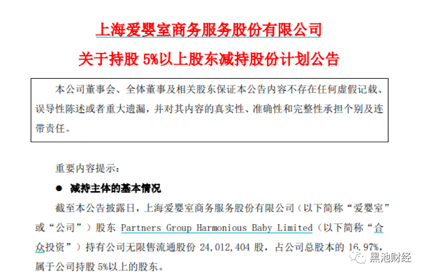 具体来看,爱婴室第二大股东Partners Group Harmonious Baby Limited(以下简称“合众投资”)拟通过集中竞价、及/或大宗交易及/或协议转让方式减持持有的公司股份不超过2401.24万股(即不超过公司总股本的16.97%)。