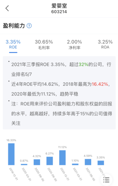而这些影响体现在爱婴室这个国内母婴品牌的财报上,就是在去年第三季度的时候,公司的净资产收益率仅为3.35%,而且从公司历年以来的净资产收益率我们也能较为直观的看到当前公司的盈利能力已经开始走下坡路了,而这,或许就是公司的第二大股东合众投资清仓式减持的主要原因吧。