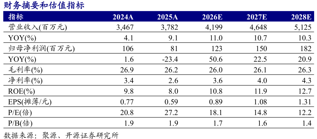 公司发布年报:2025年实现营收37.82亿元(同比+9.1%,下同)、归母净利润0.81亿元(-23.4%);单2025Q4实现营收10.57亿元(+5.8%)、归母净利润2912万元(-50.2%),业绩下滑主要系股权投资计提减值影响。考虑市场竞争激烈、新业务拓展进度低于预期,我们下调公司2026-2027年并新增2028年盈利预测,预计2026-2028年归母净利润为1.23/1.50/1.82亿元(2026-2027年原值为1.69/2.01亿元),对应EPS为0.89/1.08/1.31元,当前股价对应PE为18.1/14.8/12.2倍。我们认为,未来伴随公司自有品牌占比提升、产品结构持续优化,盈利修复确定性强,估值合理,维持“买入”评级。