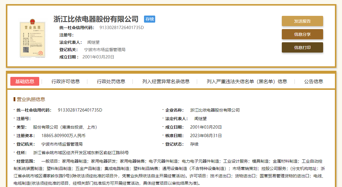 天眼查显示,比依股份成立于2001年3月20日,注册资本约1.89亿元,法人代表为闻继望。目前,该公司由比依集团有限公司持股55.65%。比依集团有限公司由比依集团(香港)有限公司100%持股。