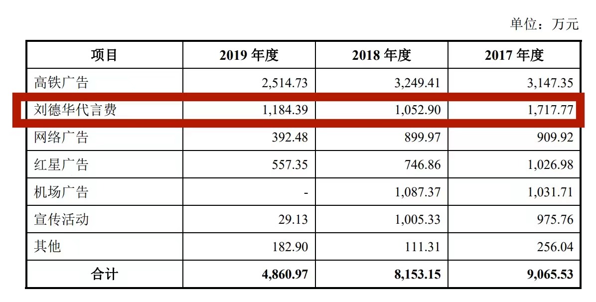 在梦天家居集团股份有限公司首次公开发行股票招股说明书(申报稿2020年6月4日报送)中显示,2017年至2019年,刘德华的代言费用分别为1717.77万元、1052.90万元、1184.39万元。其中,2018年代言费相比前一年骤减600多万元。对此,梦天家居解释称“刘德华与公司继续合作签约,给予了公司一定的折扣所致”。