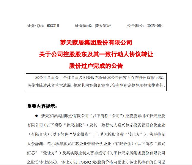 近日,梦天家居完成了一笔股权变动,引发市场关注。根据其2025年12月19日发布的公告,公司控股股东及其一致行动人通过协议方式,向嘉兴汇芯企业管理合伙企业转让了公司6.8636%的股份。本次转让股份数量为15,284,500股,交易价格定为每股17.4592元,合计套现金额约2.67亿元。股份过户已于2025年12月17日完成,交易完成后公司控制权未发生变更。