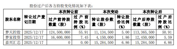 据悉,公告明确,此次套现行为主体为企业法人,而非实际控制人余静渊、范小珍夫妇个人。股份过户完成后,梦天控股的持股比例由55.91%降至50.91%,仍为公司控股股东,公司控制权未发生变更。