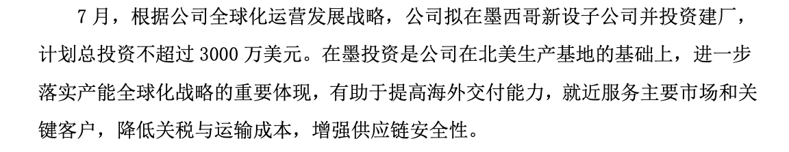 7月,根据公司全球化运营发展战略,公司拟在墨西哥新设子公司并投资建厂,计划总投资不超过3000万美元。在墨投资是公司在北美生产基地的基础上,进一步落实产能全球化战略的重要体现,有助于提高海外交付能力,就近服务主要市场和关键客户,降低关税与运输成本,增强供应链安全性。