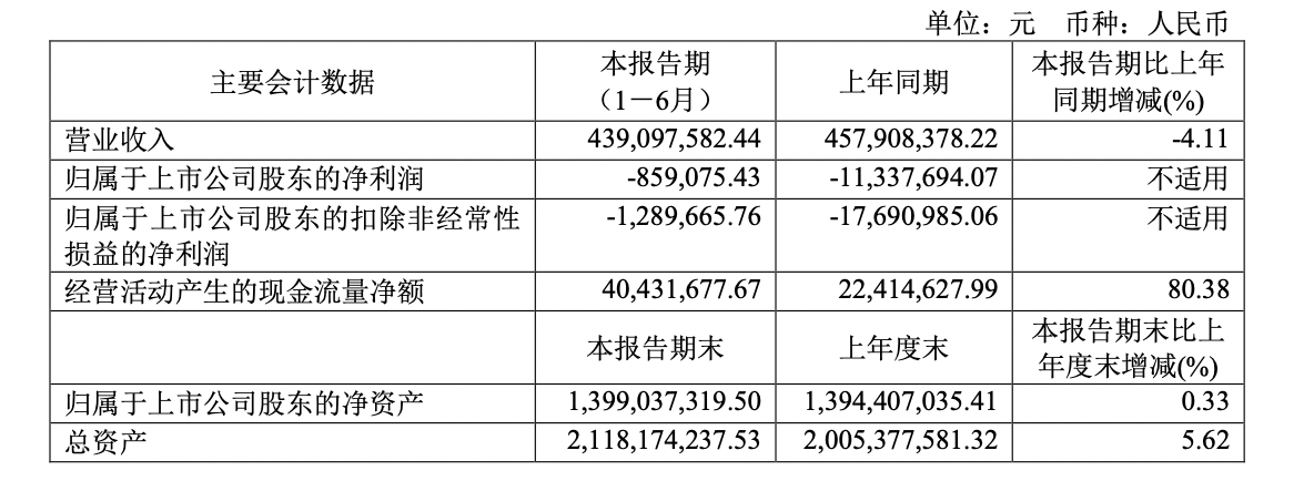 根据公告,公司实现营业收入4.39亿元,同比减少4.11%;归属于上市公司股东的净利润为-85.91万元,而上年同期为-1133.77万元。