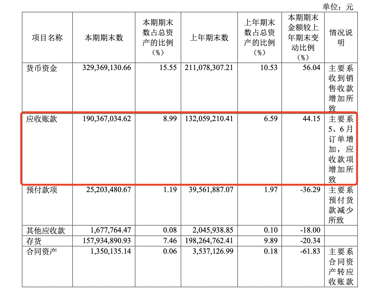 此外,公司的应收账款为1.9亿元,同比增长44.15%。对此,其解释称,主要系5、6月订单增加,应收款项增加所致。