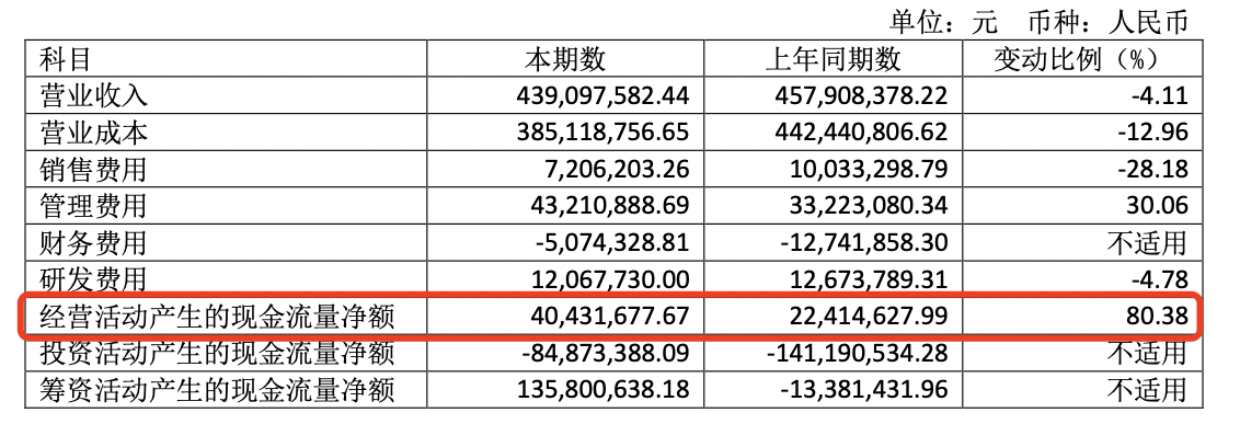 值得一提的是,报告期,公司的经营活动产生的现金流量净额为4043.17万元,同比增长80.38%。对此,其解释称,主要系购买商品、接受劳务支付的现金减少所致。