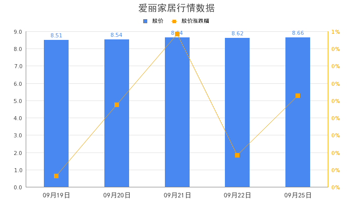 截至09月25日,爱丽家居(603221.SH)股价收盘8.62元,涨0.46%,成交总额2,671.46万元,总市值20.78亿元。