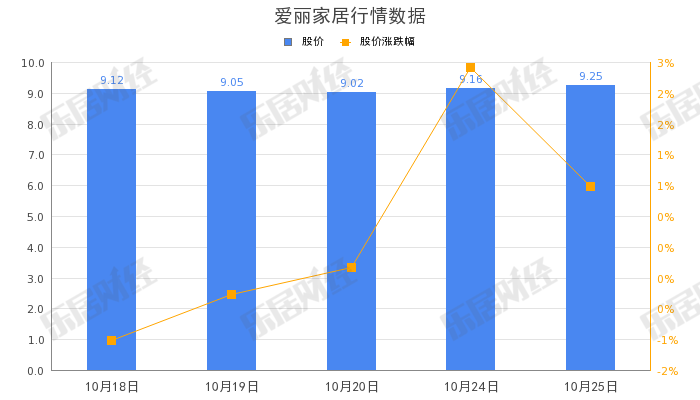 截至10月25日,爱丽家居(603221.SH)股价收盘9.16元,涨0.98%,成交总额2,062.78万元,总市值22.20亿元。