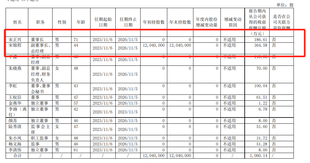 宋正兴现任公司董事长,江苏优程监事,东方宏海新能源科技发展有限公司董事,目前已71岁高龄。报告期内宋正兴从公司获得的税前报酬总额186.61万元。宋锦程任副董事长、总经理,报告期内从公司获得的税前报酬总额364.58万元。据了解,宋正兴与宋锦程为父子关系。