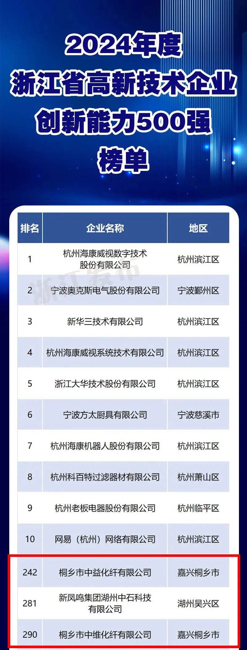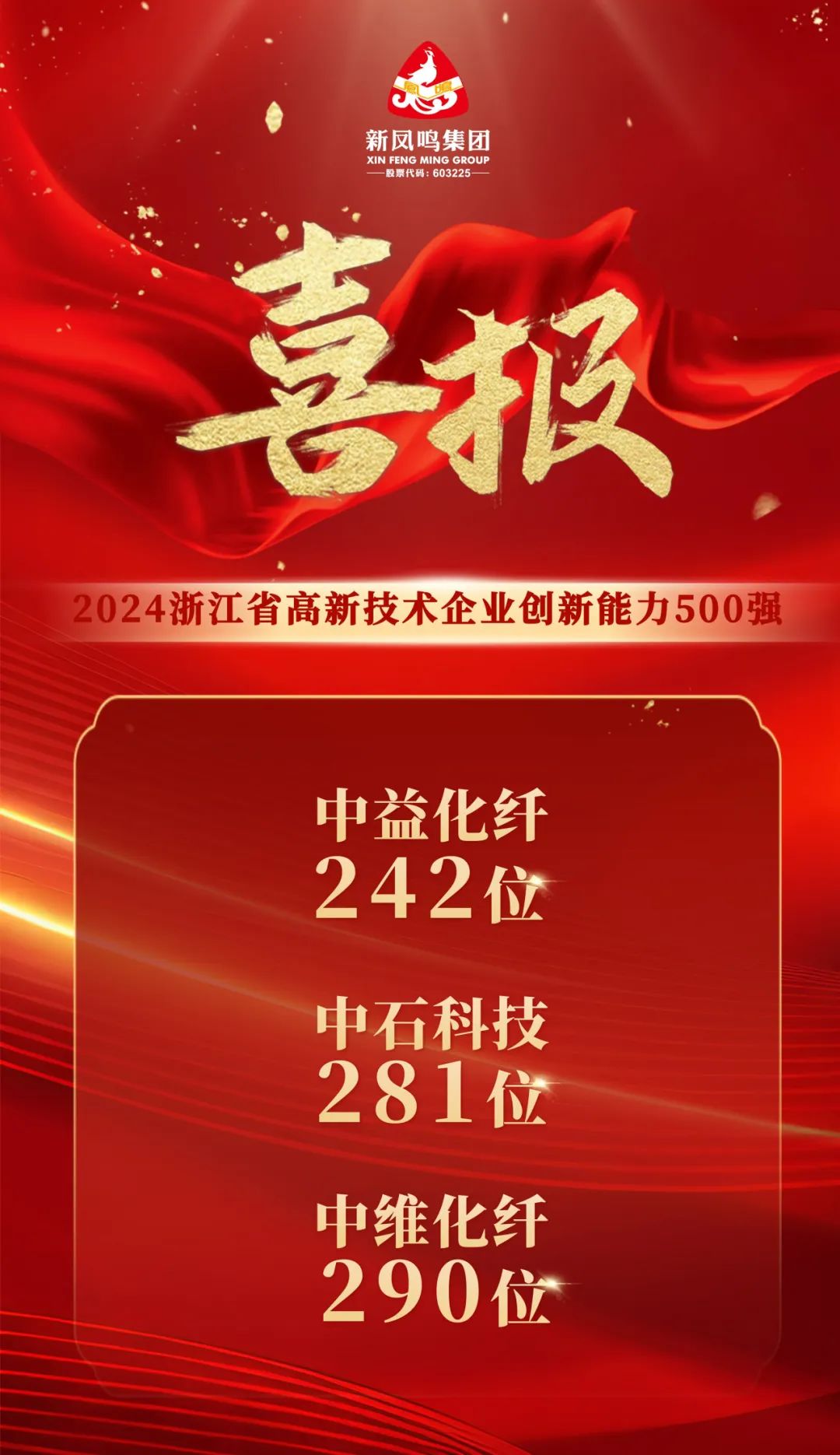 近日,2024年度浙江省高新技术企业创新能力500强榜单出炉,新凤鸣中益化纤、中石科技、中维化纤纷纷上榜,分别位列242、281、290位。