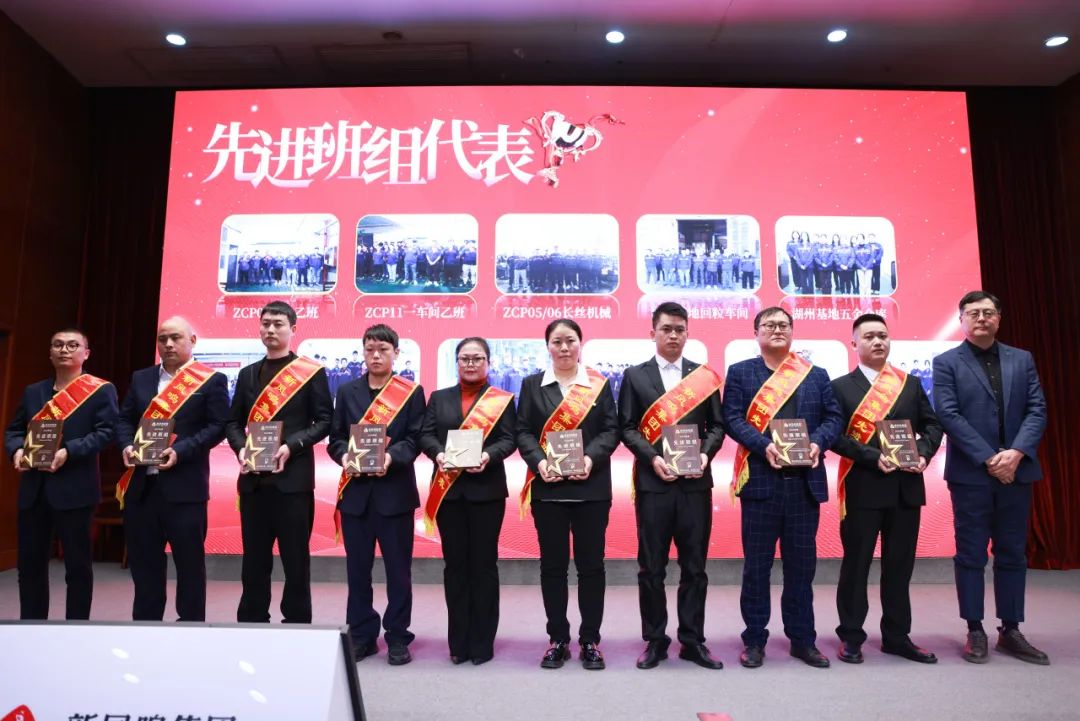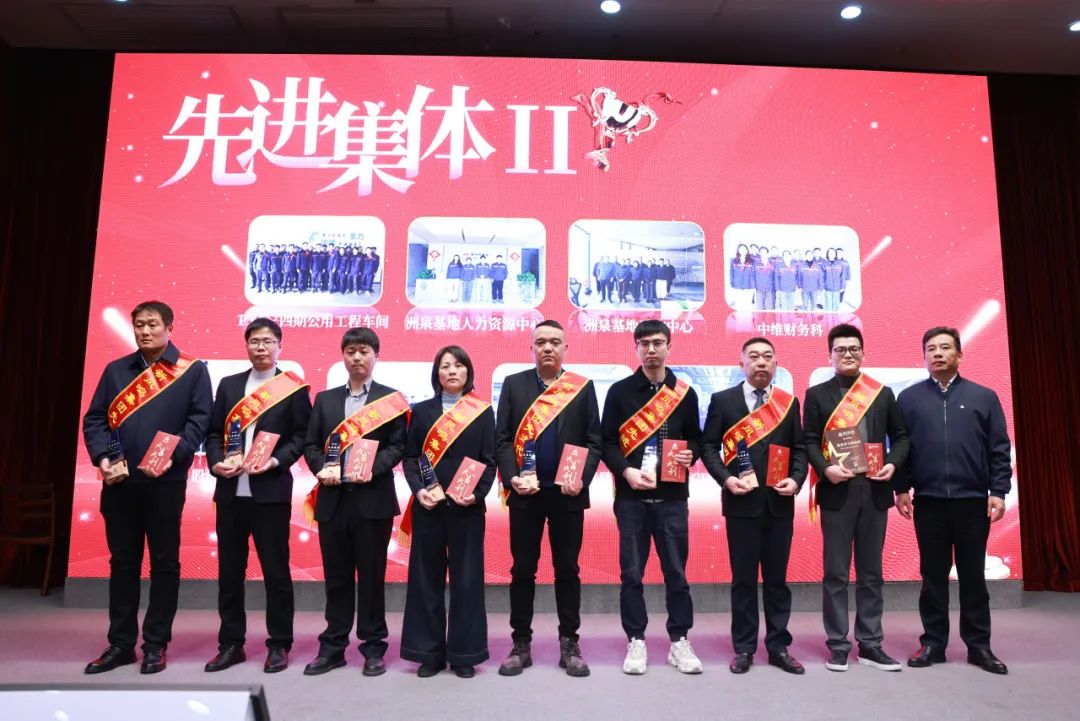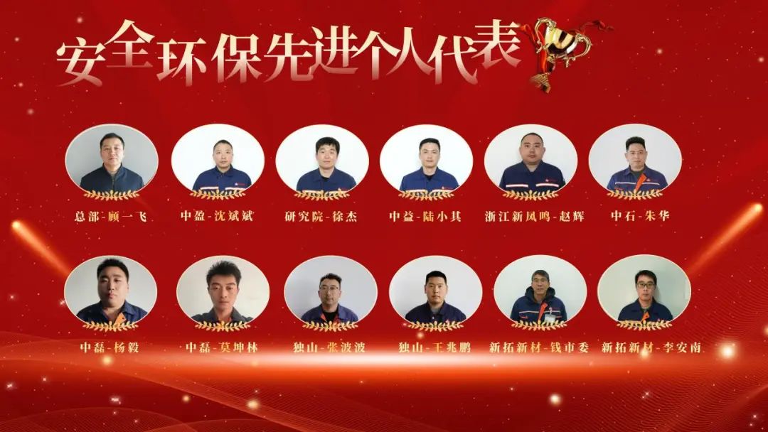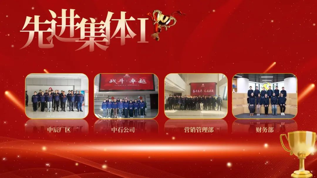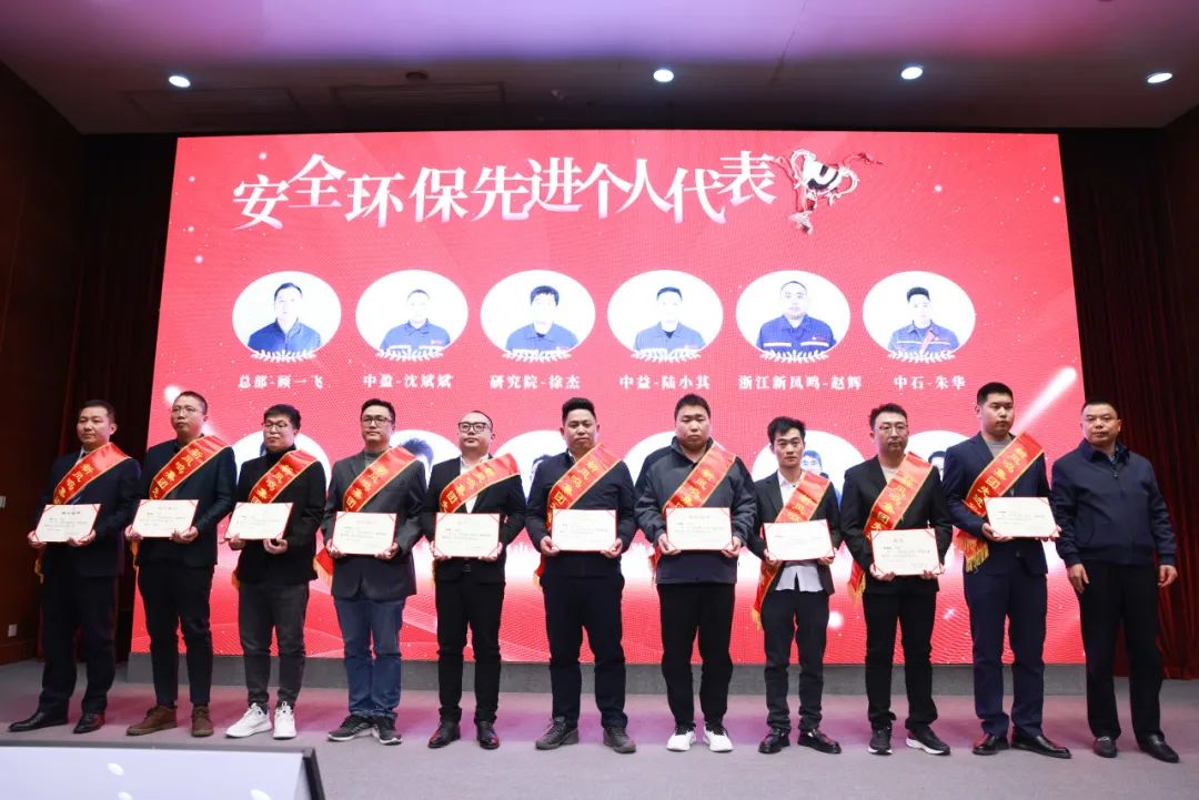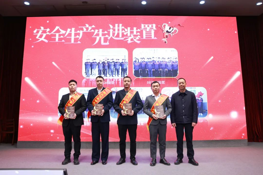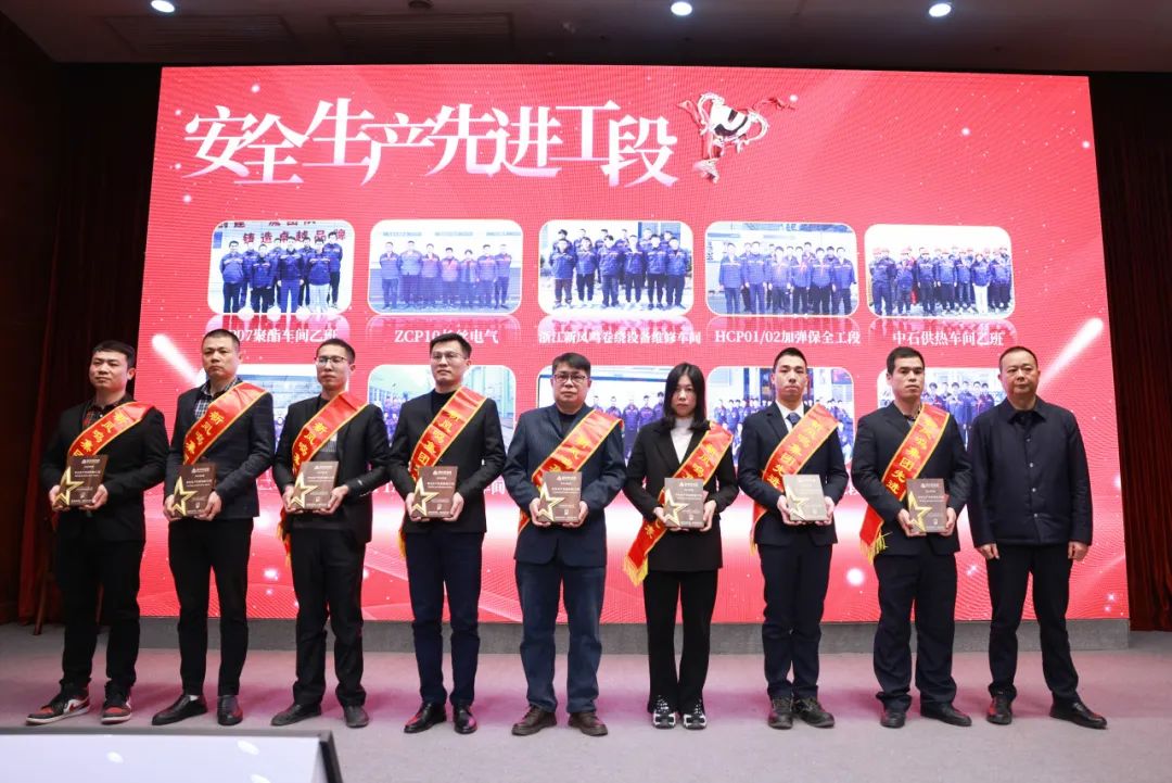 执行总裁沈健彧宣读2024年度表彰文件,2024年共评选出:先进集体20个、先进班组(工段)66个、6S优胜车间5个、文明寝室16个、先进个人1214名,培训学习先进30名,最佳学习型组织1个,安全生产先进装置5个,安全生产先进工段10个,安全环保优秀员工12名,市级以上荣誉87名。