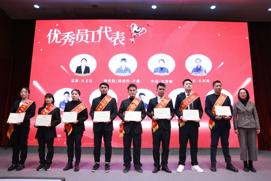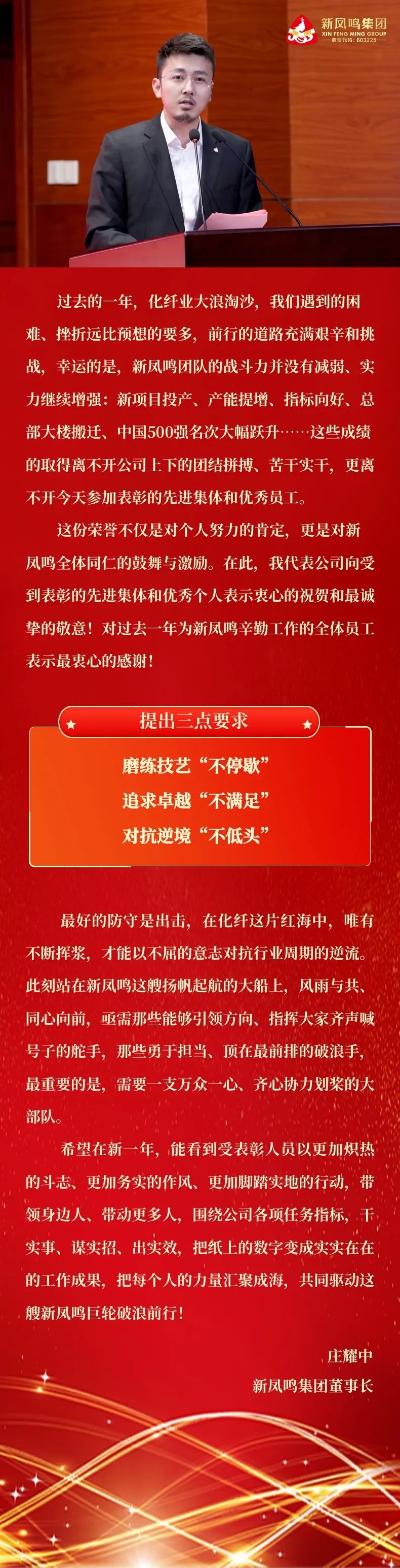 1月15日下午,新凤鸣集团2024年度表彰大会顺利召开。集团董事长庄耀中、执行总裁沈健彧等领导出席大会。科长级及以上人员,各部门、子公司受表彰代表等共计200余人现场参会,各基地以观看直播形式参加。