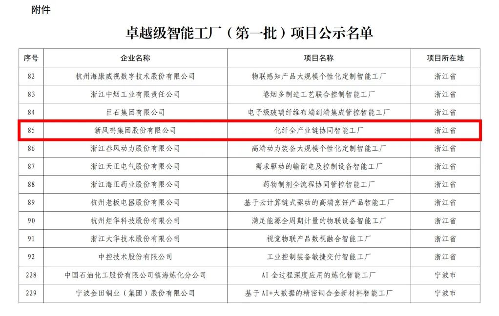 祥龙贺岁辞旧去,瑞凤迎春启新程!近日,历经企业主体申报、遴选推荐、专家评估和部委公示,新凤鸣集团“化纤全产业链协同智能工厂”入选国家“卓越级智能工厂(第一批)项目名单(共235家)”,是浙江省上榜的13家企业之一,也是化纤行业唯一上榜企业。
