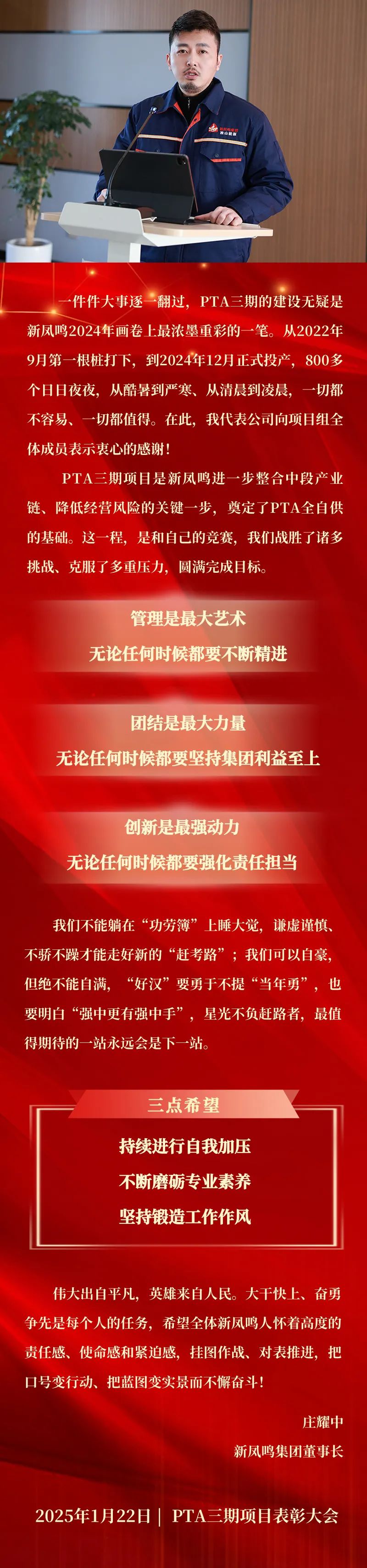 千淘万漉虽辛苦,吹尽狂沙始到金。庄董代表公司向奋战在项目一线的先进代表表示衷心感谢,并致以崇高敬意!庄董回顾20多年来艰苦创业史,见证了PTA从无到有,再走向全球的不容易,在当今发展之快、压力之重的形势下,我们更要坚定抢抓产业机遇的信心,不断突破自我、超越自我。接下来,PTA三期项目要全力夯实精益制造管理基础,持续在“运行质量”上做加法,“节能降耗”上做减法,汇聚全员力量,以管理创新激发内生动力,勇毅笃行。PTA四期项目建设团队要时刻铭记在高质量发展的同时把速度放在首位,以“加速度”全力冲刺项目建成总目标。