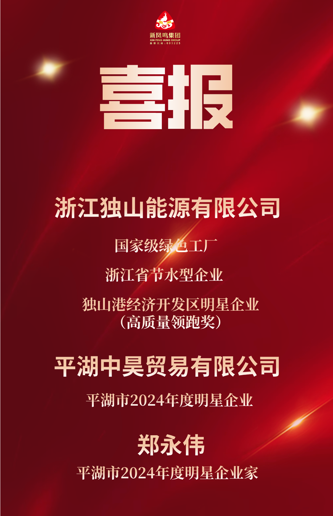 近日,平湖市三级干部大会、独山港经济开发区(独山港镇)干部大会顺利召开。“各级”会议强调要坚持以习近平新时代中国特色社会主义思想为指导,全面贯彻落实党的二十大和二十届二中、三中全会精神,深入学习贯彻习近平总书记重要讲话重要指示批示精神,忠实践行“八八战略”,聚焦“一个首要任务、三个主攻方向、两个根本”,大力倡导“六干争先”抓落实,动员广大党员干部群众干字当头、实字为要,坚定扛起经济大市挑大梁的责任担当,加快打造长三角城市群重要中心城市,奋力谱写中国式现代化嘉兴新篇章。新凤鸣集团浙江独山能源有限公司、平湖中昊贸易有限公司获得多项荣誉。