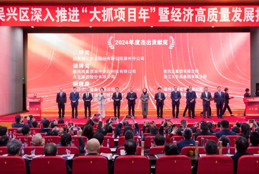 2025年2月5日下午,湖州市持续深化“在湖州看见美丽中国”实干争先主题实践推进会在湖州大剧院隆重召开,市委书记陈浩出席会议并讲话,市委副书记、市长连坤明主持。会上,新凤鸣湖州基地荣获2024年度湖州市“金象”企业、市纳税大户荣誉称号,基地董事长沈虹上台领奖,这已是公司连续七年获得此项荣誉。