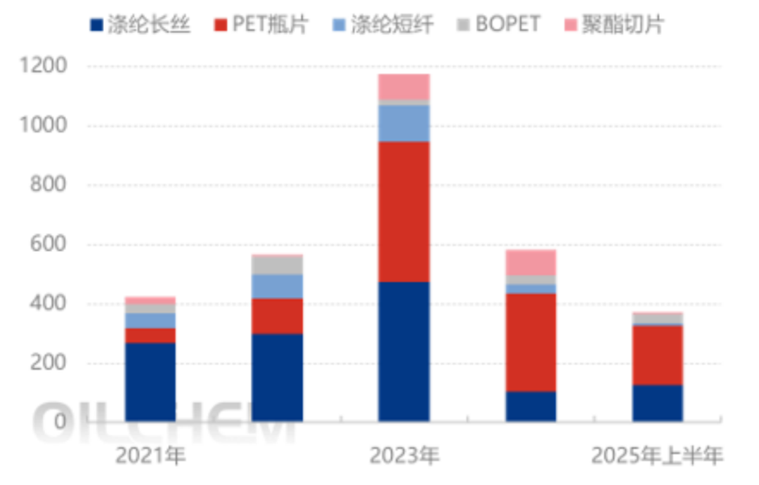 2025年上半年,中国聚酯行业新装置累计投产370万吨/年,共计10套装置,相较于2024年上半年11套新装置313万吨/年的投产规模,在投产数量减少的情况下,投产产能规模同比增速达18.2%较为可观,同比去年上半年增幅接近两成。并且从投产时间维度来看,今年上半年国内聚酯新装置的投产规模在近五年内属于第二高水平,仅次于2023年上半年,国内聚酯行业新产能投放依旧处于扩张区间。