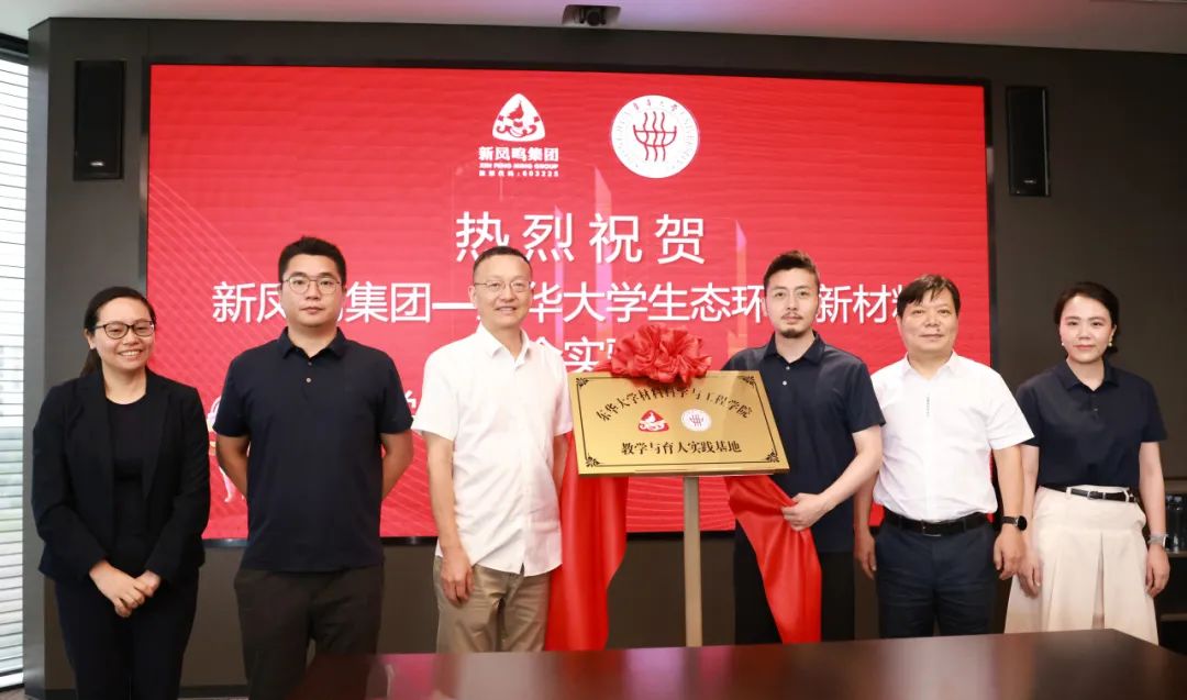 东华大学东华大学材料科学与工程学院党委书记李斌荣、新凤鸣集团董事长庄耀中共同为“东华大学教学与育人实践基地”揭牌。