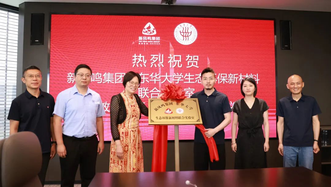 东华大学先进纤维材料全国重点实验室主任朱美芳、新凤鸣集团董事长庄耀中共同为“新凤鸣-东华大学生态环保新材料联合实验室”揭牌。