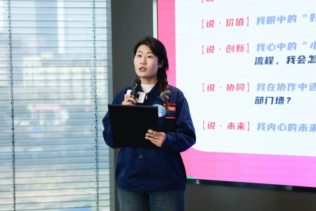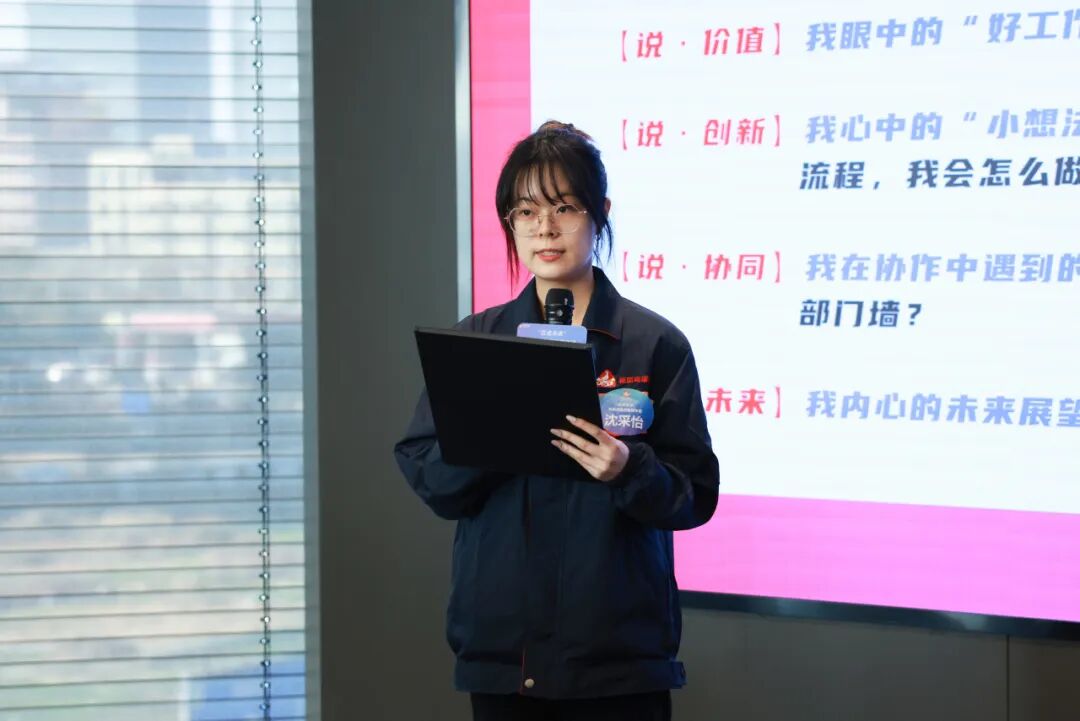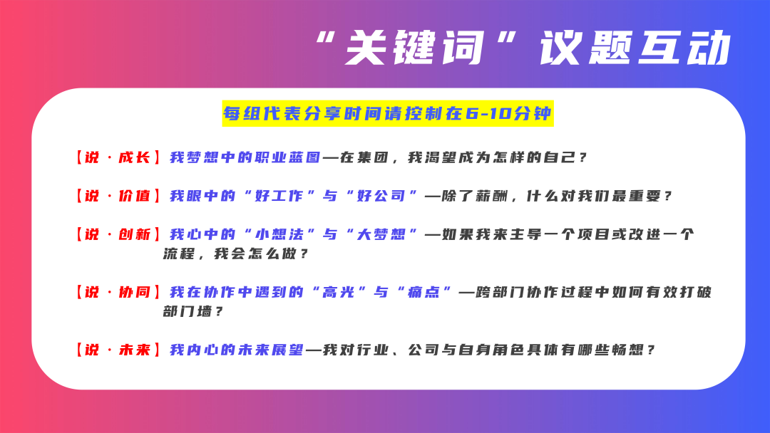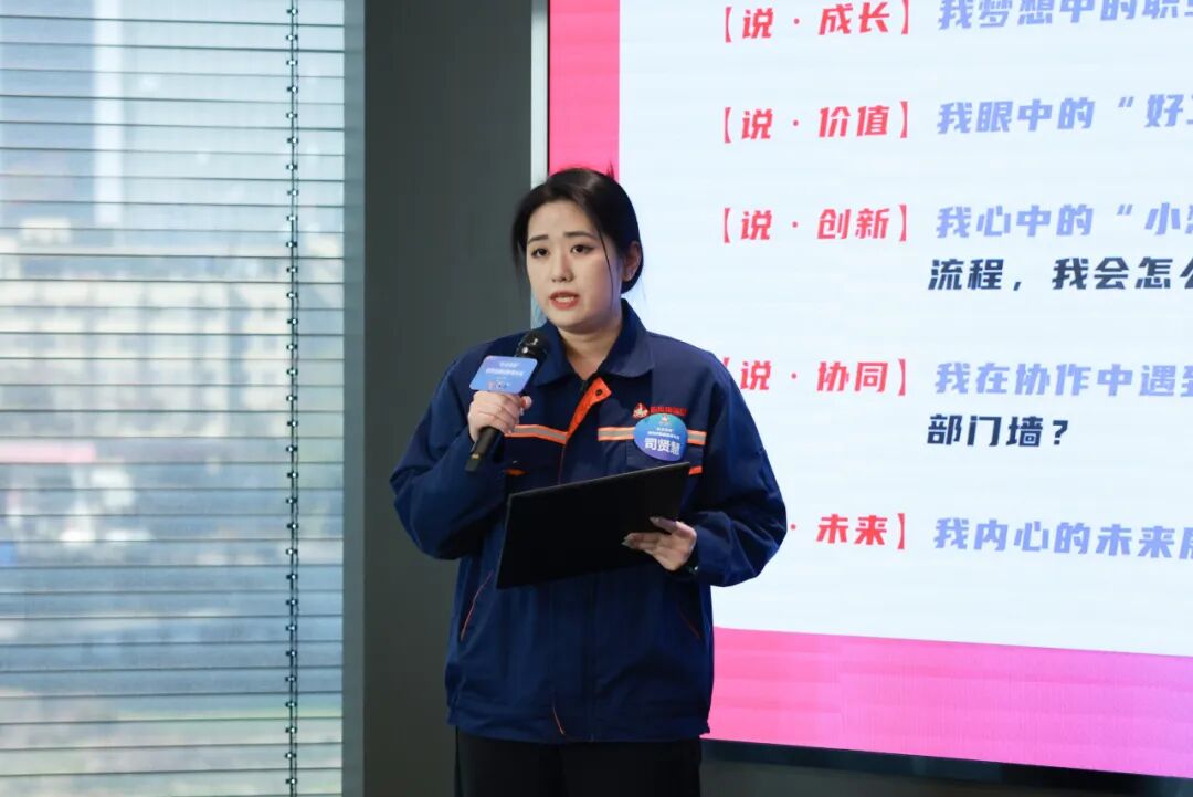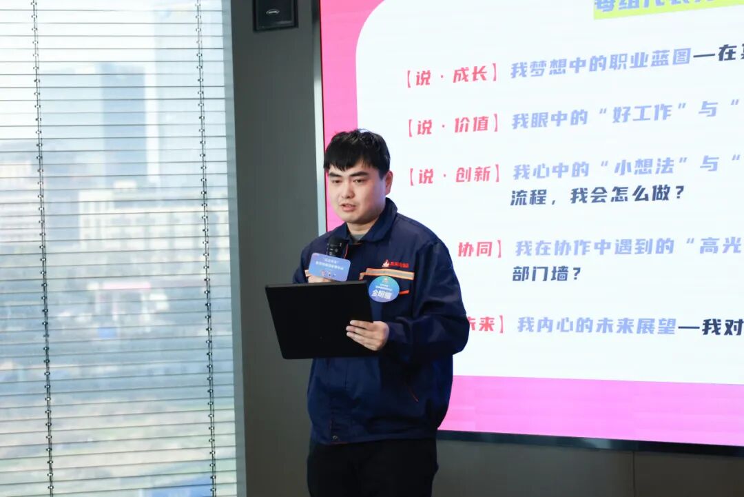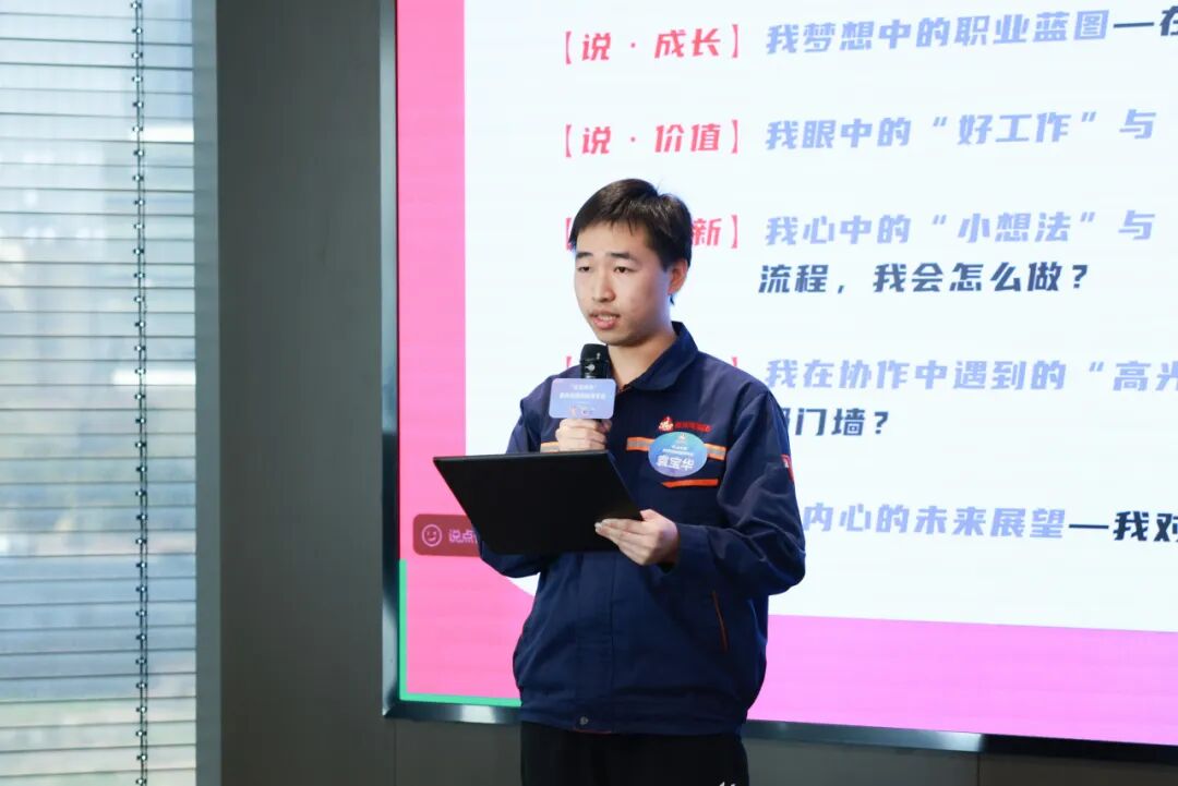 围绕 “说·成长、说·价值、说·创新、说·协同、说·未来”五大关键词,总部及各基地的5位青年代表依次登场,分享他们在集团中的观察、体会与梦想。这其中,既有对个人职业蓝图的勾勒,也有对集团发展的务实建议。