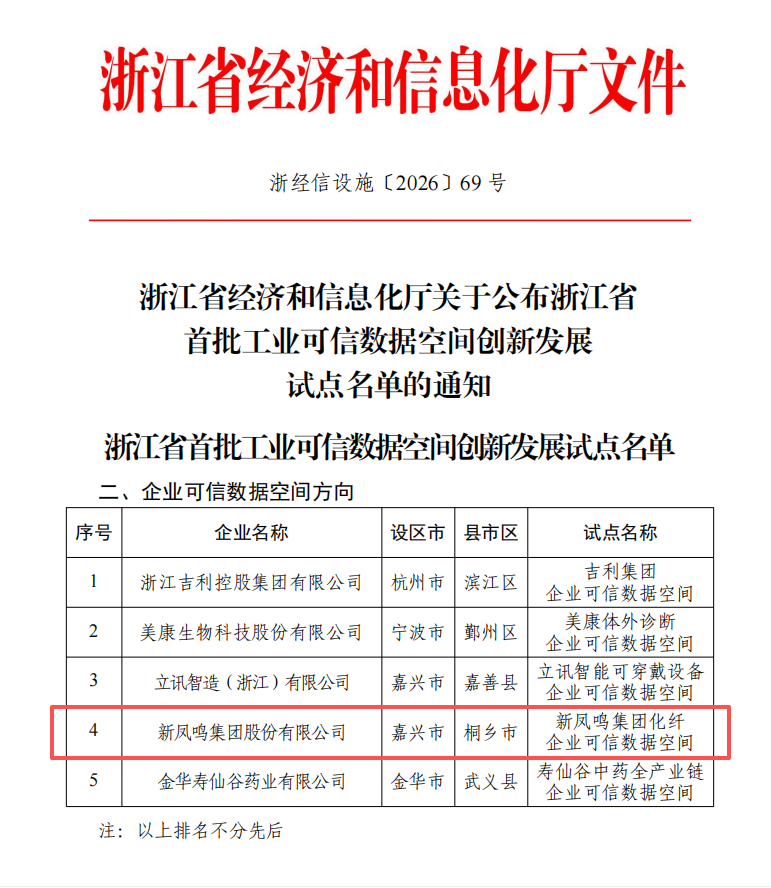 此次入选,是对新凤鸣集团数据治理、数据应用和数据服务体系的充分肯定,也彰显了五疆发展技术实力、创新活力和数商生态建设的标杆作用。未来,我们将深入抢抓数据要素产业发展新机遇,主动融入全省“完善数商培育政策、赋能‘415X’先进制造业集群、助力人工智能创新发展高地”的战略布局,在数据价值化的浪潮中,贡献更多的“新凤鸣样本”,更多的“五疆力量”。