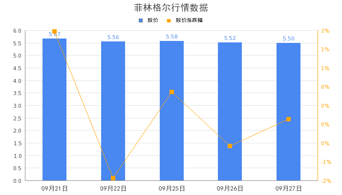 截至09月27日,菲林格尔(603226.SH)股价收盘5.52元,跌-0.36%,成交总额2,269.64万元,总市值19.55亿元。