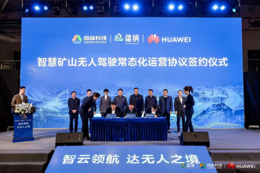 在相关政府领导及各公司领导的共同见证下,雪峰爆破董事长郭润华与疆纳集团常务副总经理、新疆疆纳矿业董事长李伟、华为公司新疆云业务总经理蒋魁强签订了无人驾驶常态化运营协议,由雪峰爆破公司负责无人驾驶整体运营,开创了无人驾驶由设备技术方运营到施工方自主运营的先河,标志着三方联合应用“新质”技术,赋能智慧矿山建设,打造全国首个无人驾驶联合运营标杆,推动矿山无人驾驶行业更进一步。