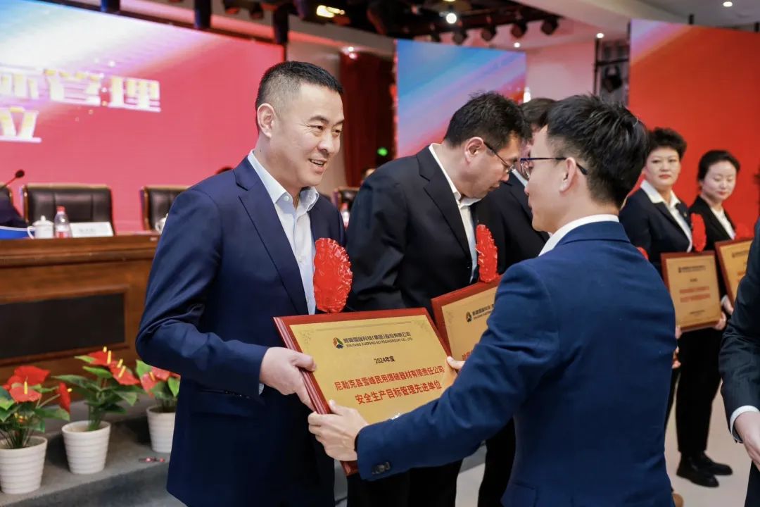 会议表彰了2024年度先进集体和先进个人,受表彰的先进基层党组织、先进单位、安全生产目标管理先进单位代表上台领奖。