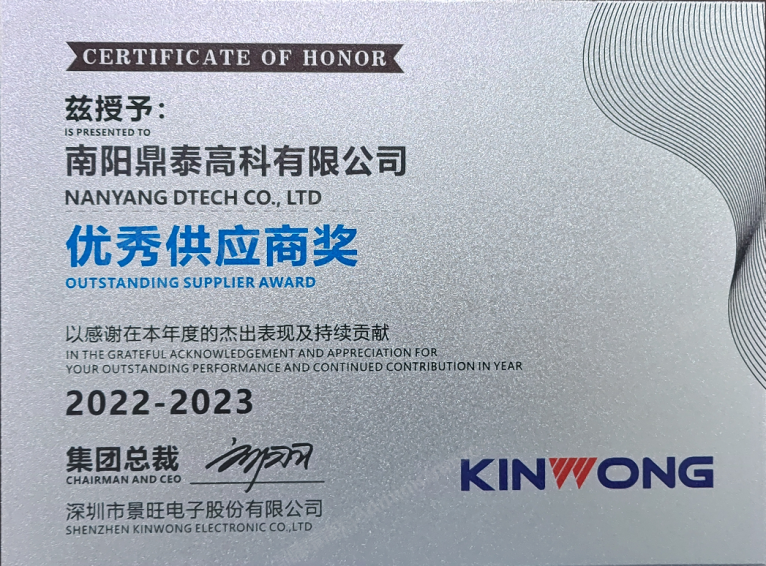 近日,深圳市景旺电子股份有限公司隆重举行第五届全球商业合作伙伴大会,活动现场,景旺电子董事长刘绍柏先生和采购总监刘海燕女士共同向鼎泰高科营销总裁林侠颁发了“优秀供应商奖”,自2019年开始南阳鼎泰已连续两次获此殊荣。这份沉甸甸的荣誉,代表着景旺电子对于南阳鼎泰多年来在产品质量、成本、交付等方面提供的支持给予高度认可。